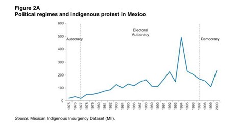 اما علاوهبر این دو محور یک شاخص سومی نیز مطرح میشود. ساختار فرصت سیاسی برای اعتراض بسیار جدی است. در دل بحرانیترین شرایط ممکن مانند قحطی بزرگ در چین دوران مائو یا مشابه آن در اوکراین دوران استالین، هیچ اعتراضی شکل نمیگیرد. در شرایطی که سطح بالایی از خفقان امکان کنش جمعی شهروندان را سلب کرده شکل گرفتن اعتراض بسیار دشوار میشود. در پژوهشهای مختلف دیده میشود که بستهترین اقتدارگراییهای زمانهی ما یعنی ساختارهایی که فاقد هرگونه انتخابات رقابتی در سطح ملی هستند مانند ترکمنستان، عربستان، چین، کرهی شمالی و بسیاری دیگر تمامی فرصتها برای ایجاد کنش جمعی شهروندان را از بین میبرند. بنابر دو پژوهش متفاوت در نمودار اول شاهد هستیم که وقوع انقلابهای شهری در ساختارهای اقتدارگراییِ بسته کمتر محتمل است و در نمودار دیگر شاهد هستیم که میزان وقوع خیزشهای اعتراضی در درون یک حکومت غیردمکراتیک خاص (مثال مکزیک) با تبدیل شدن از یک اقتدارگرایی بسته به یک اقتدارگرایی رقابتی افزایش مییابد و با دموکراسیسازی کاهش مییابد.
