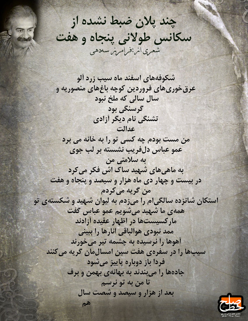 In the month of Esfand, the blossoms of yellow apples and plums The taverns of Farvardin, the gardens of Mansouriye And every year that there was no locust There was hunger Thirst, another name for freedom Justice I was drunk, who would take you home Uncle Abbas, sitting by the river To my health Thinking […]...